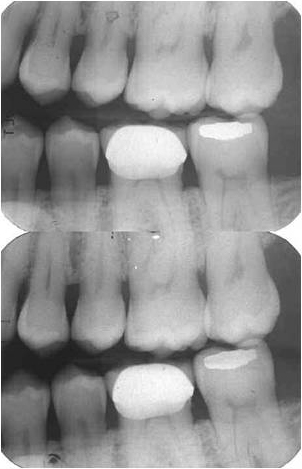 Today D- and E-speed films are virtually identical in image quality. When E-speed film was first introduced the image quality was somewhat inferior to D-speed film which resulted in a now undeserved reputation of grainy and low contrast images. The two films below look almost identical but with a significant difference in dose. The E-speed film (top) required a dose of 120 mrad while the D-speed film (bottom) required 200 mrad. This results in a dose reduction of approximately 40% for patients and staff.
